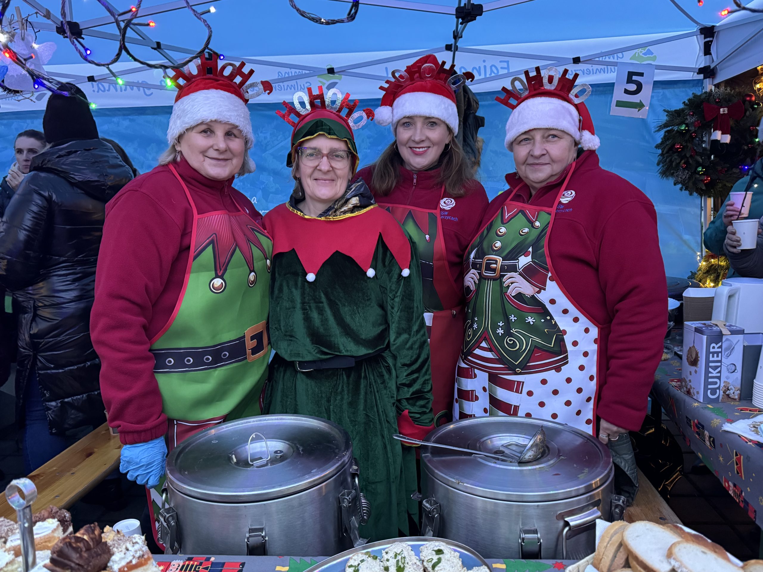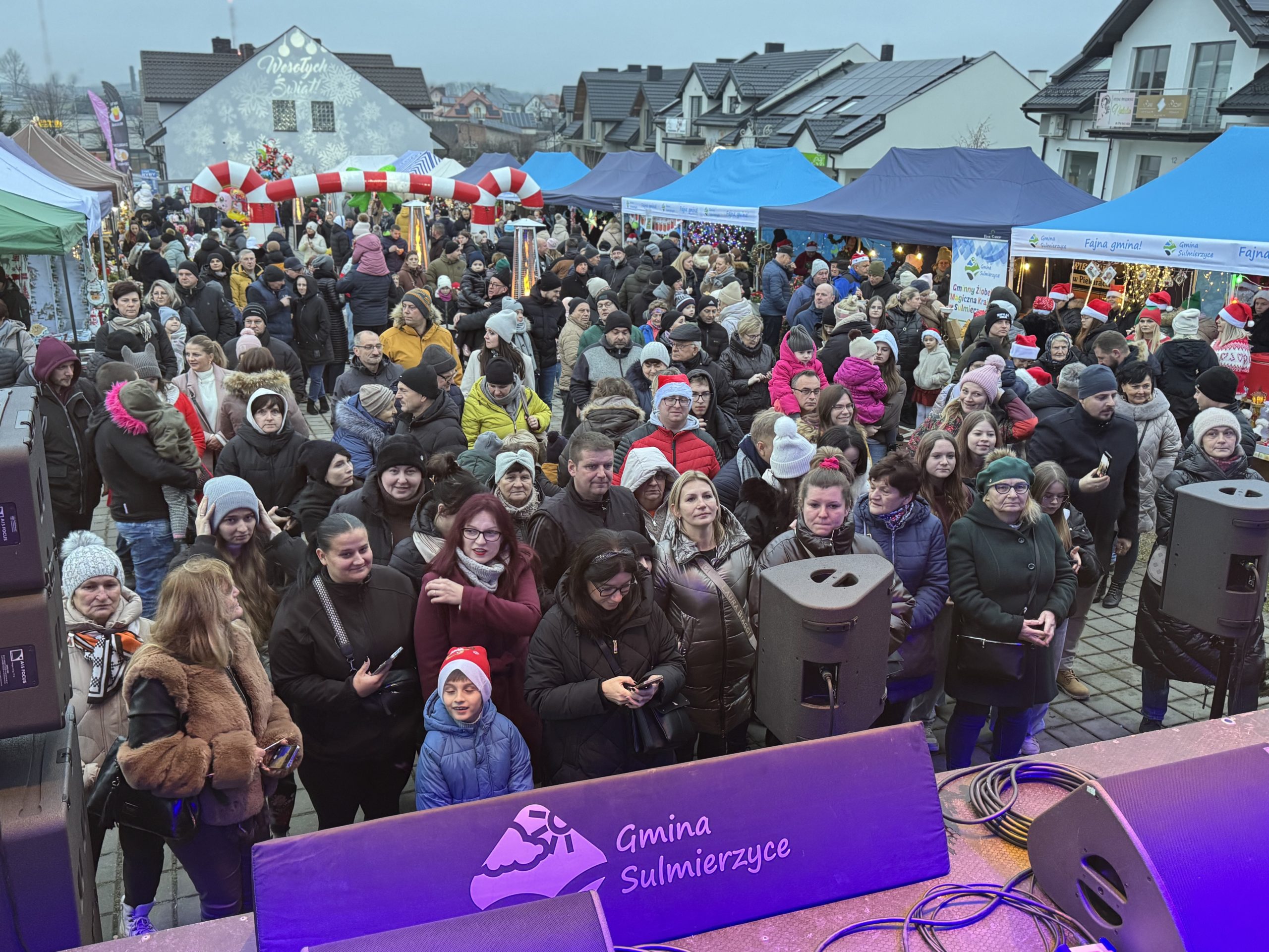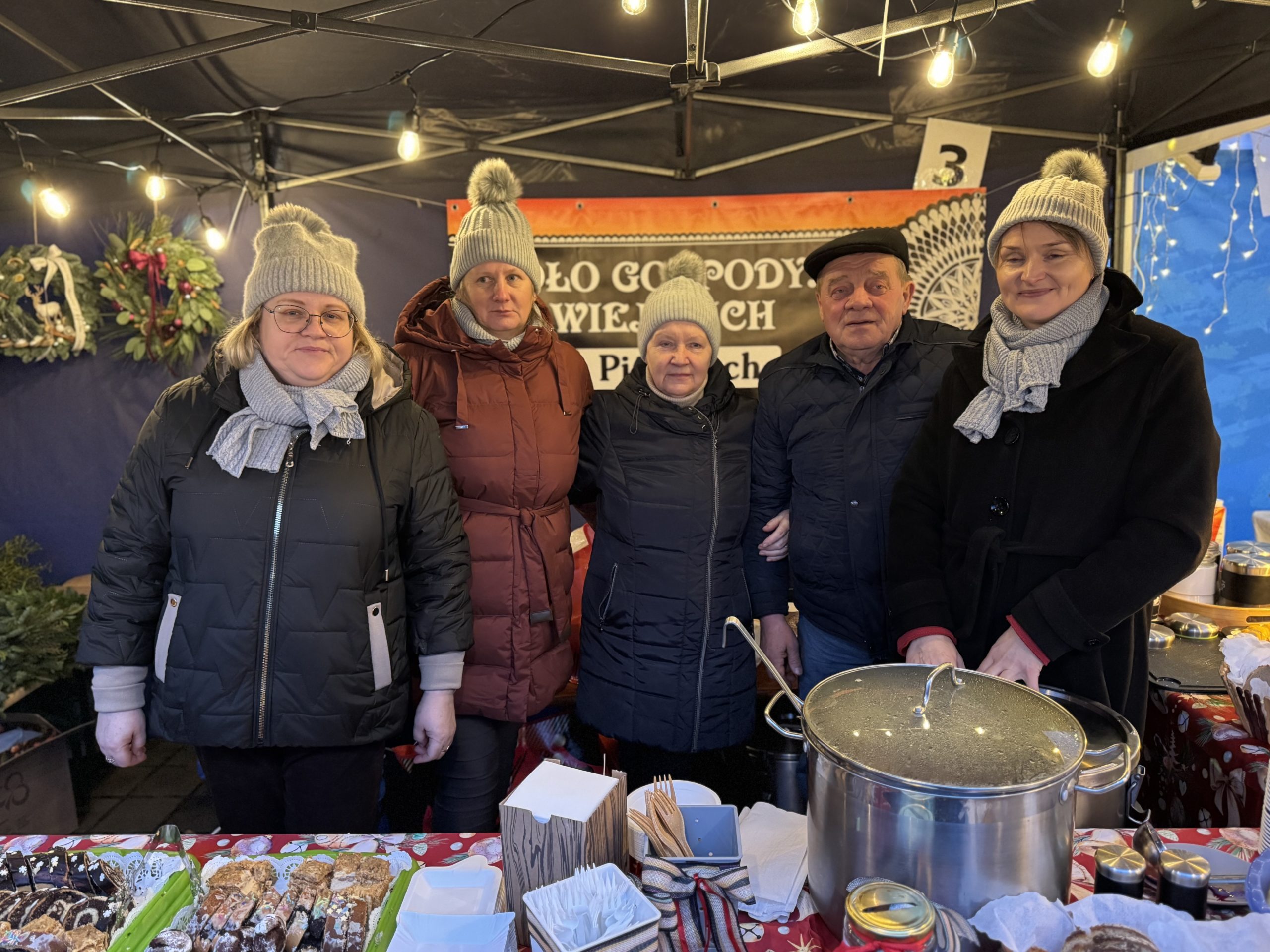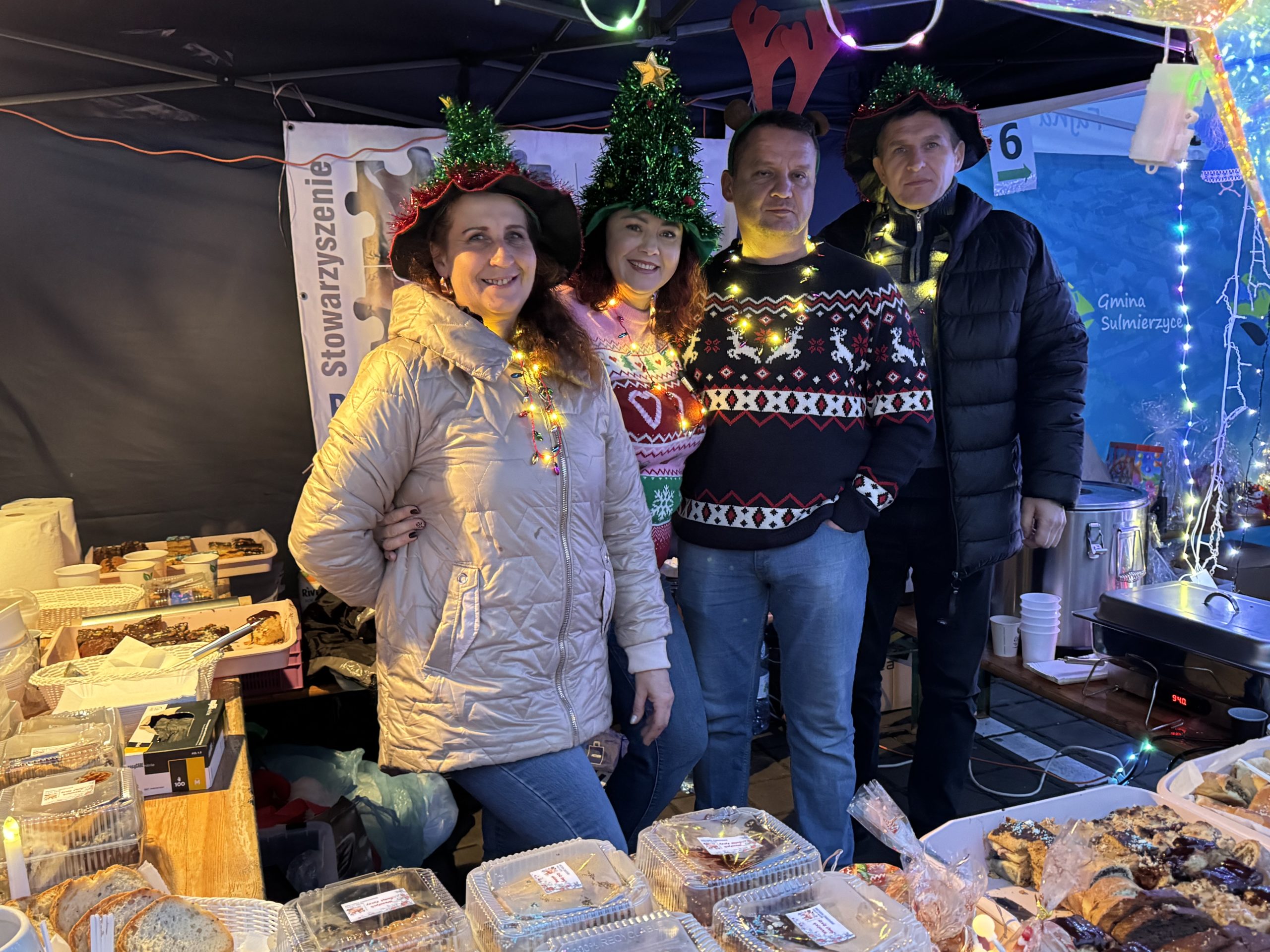Przed sceną natomiast, przygotowane zostały stoiska z asortymentem świątecznym. Bardzo liczne grono odwiedzających, oprócz wszelakich ozdób i upominków mogło zakupić między innymi: chrzan, miód czy naturalne soki. Dla smakoszy, Koło Gospodyń Wiejskich z Sulmierzyc, Koło Gospodyń Wiejskich z Piekar, Koło Gospodyń Wiejskich z Kodrania, Stowarzyszenie Niezniszczalni, Stowarzyszenie Razem Łatwiej, Stowarzyszenie Miłośników Pszczoły Miododajnej „Pszczółka” przygotowały świąteczne potrawy, które cieszyły się ogromnym zainteresowaniem. Ponadto podczas jarmarku można było skonsumować oscypki oraz spróbować grzańca.